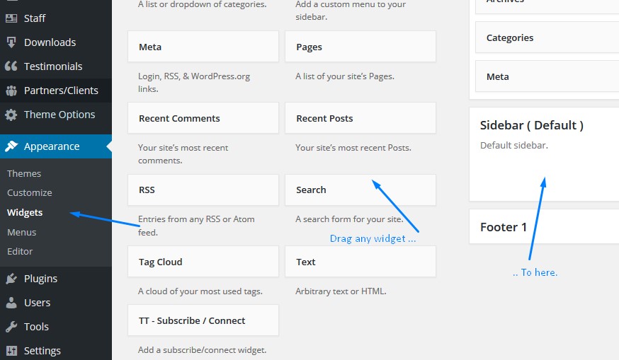 To put Widgets in sidebar, please go to Appearance / Widgets and drag Widgets of your choice to Default Sidebar Widget area.