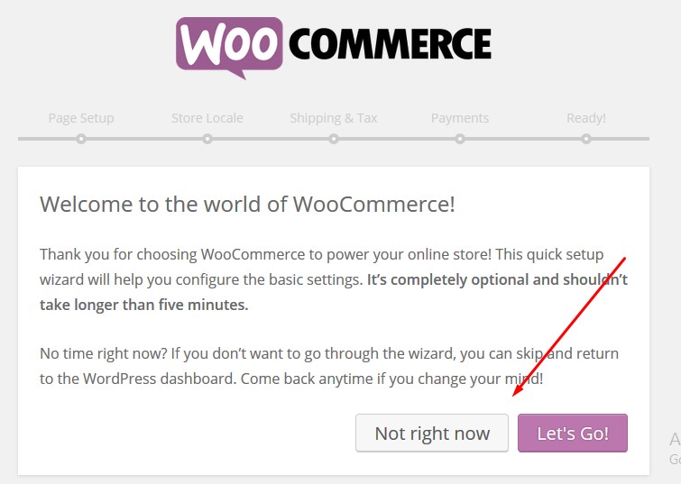 - At this point, you might see Woocommerce setup wizard popup. If you do, Please skip this for now. (see image 5 below.)