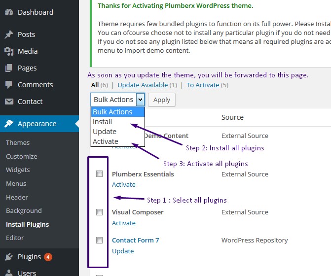 - As soon as you activate the theme, you will be forwarded to install few plugins, please install theme, and then activate them. (refer image 1 below)