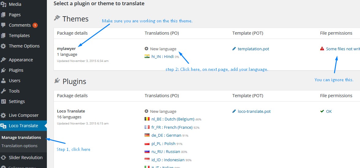 3) Once plugin is activated, you will find a new menu on left. Please go to Loco Translate -> Manage translations, and click on New language link of ramarino theme. (Please disregard theme name in following screenshot, it was built for another theme. You can still follow the same steps.)
